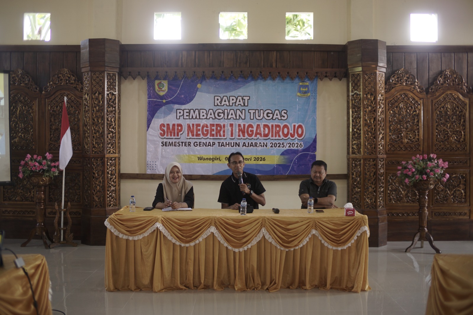 SMP Negeri 1 Ngadirojo melaksanakan kegiatan pembagian tugas mengajar semester genap tahun ajaran 2025/2026 pada Jumat, 2 Januari 2026. Kegiatan ini bertempat di Rumah Makan Gecol, Kecamatan Eromoko, dan diikuti oleh seluruh guru serta tenaga kependidikan SMP Negeri 1 Ngadirojo.